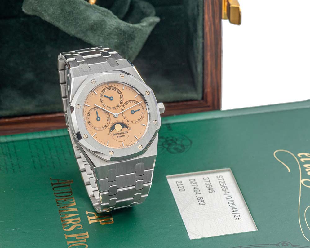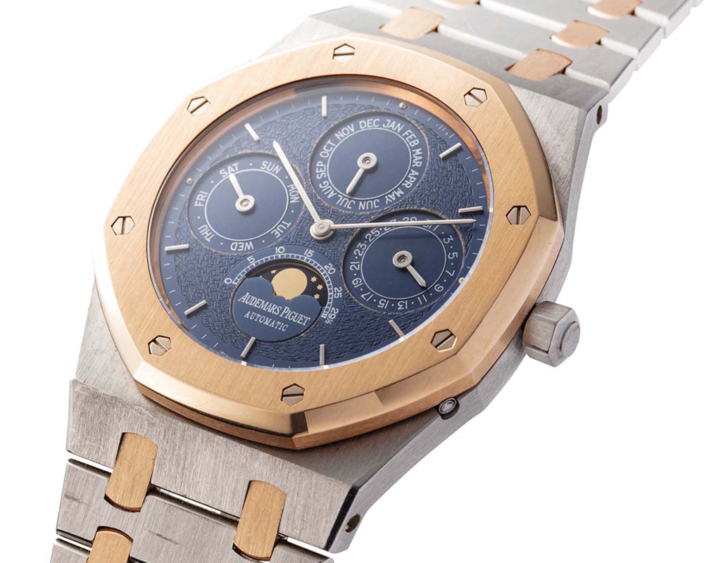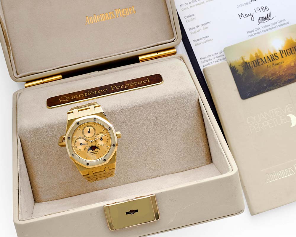 Audemars Piguet’s Royal Oak Perpetual Calendar -year 1986- in 18K yellow gold with day, date, month and moon phases (Lot 171). This Ref. 25554 Royal Oak Perpetual Calendar dates back to 1986 and is one of the very first perpetual calendar Royal Oaks manufactured.