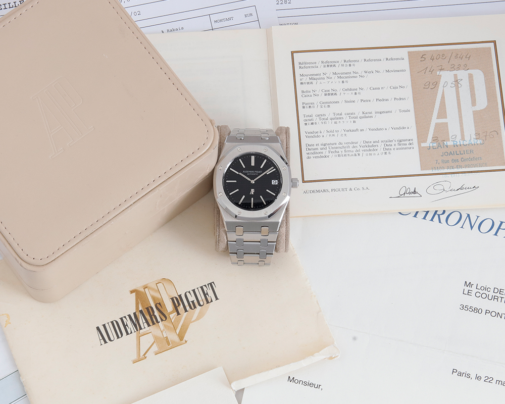 Audemars Piguet’s Royal Oak -year 1976- Ref. 5402ST, intermediary series; stainless steel (Lot 430) Fine and very rare, stainless steel, self-winding, tonneau-shaped, gentleman’s wristwatch, with a black lacquered dial and date. With original box, certificate, and service invoices.