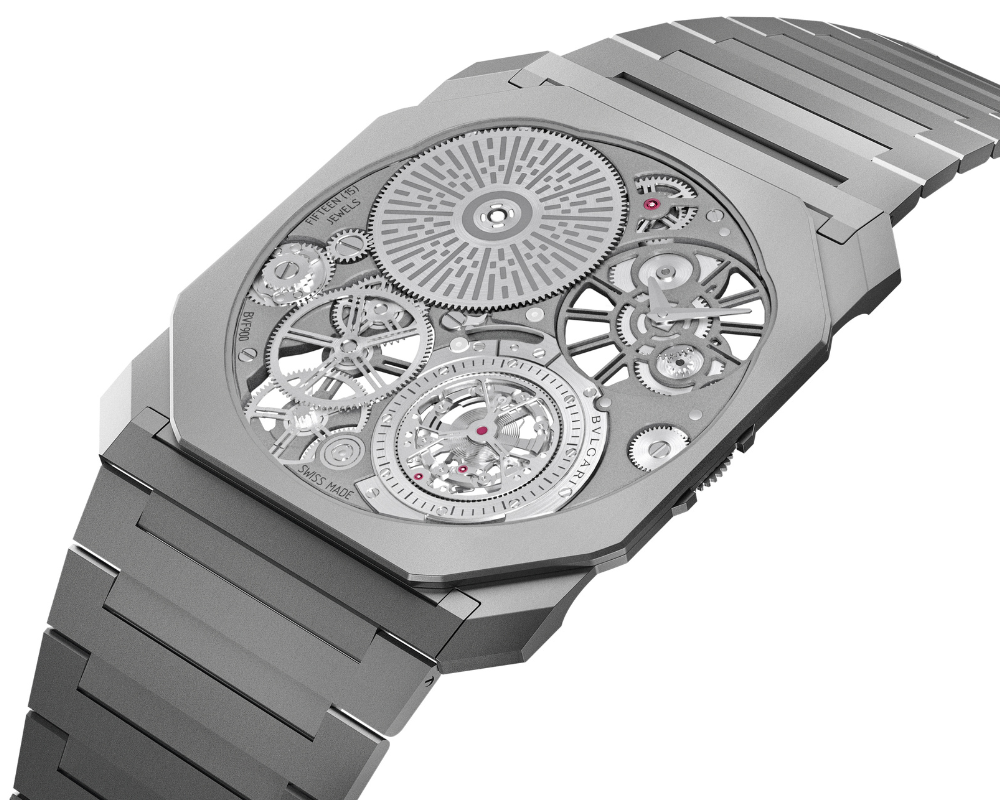 Para alcançar esse feito, a Bvlgari reinventou conceitos tradicionais da relojoaria, transformando um relógio tridimensional em uma peça bidimensional. A esqueletização do movimento maximiza a passagem de luz e revela:
