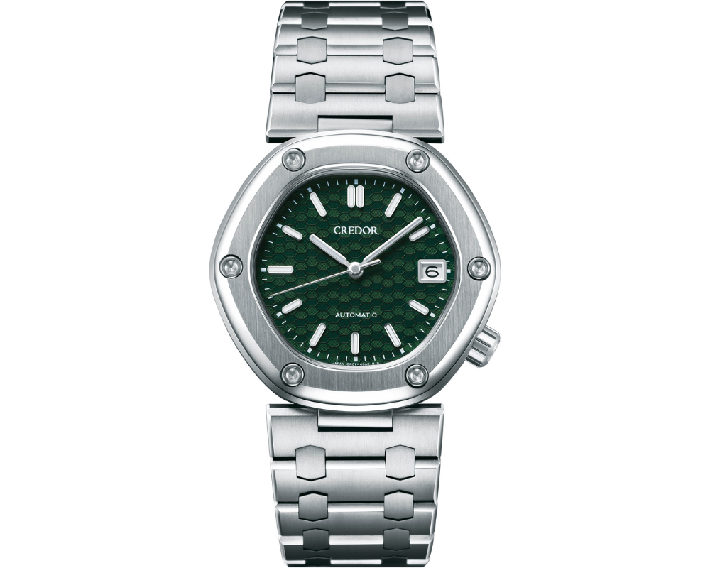 Em comemoração ao 50º aniversário da marca, a Credor relançou o icônico modelo Locomotive, criado por Gérald Genta. A edição 2025 apresenta um mostrador verde marcante com padrão geométrico hexagonal, remetendo à forma da caixa e do aro do relógio.