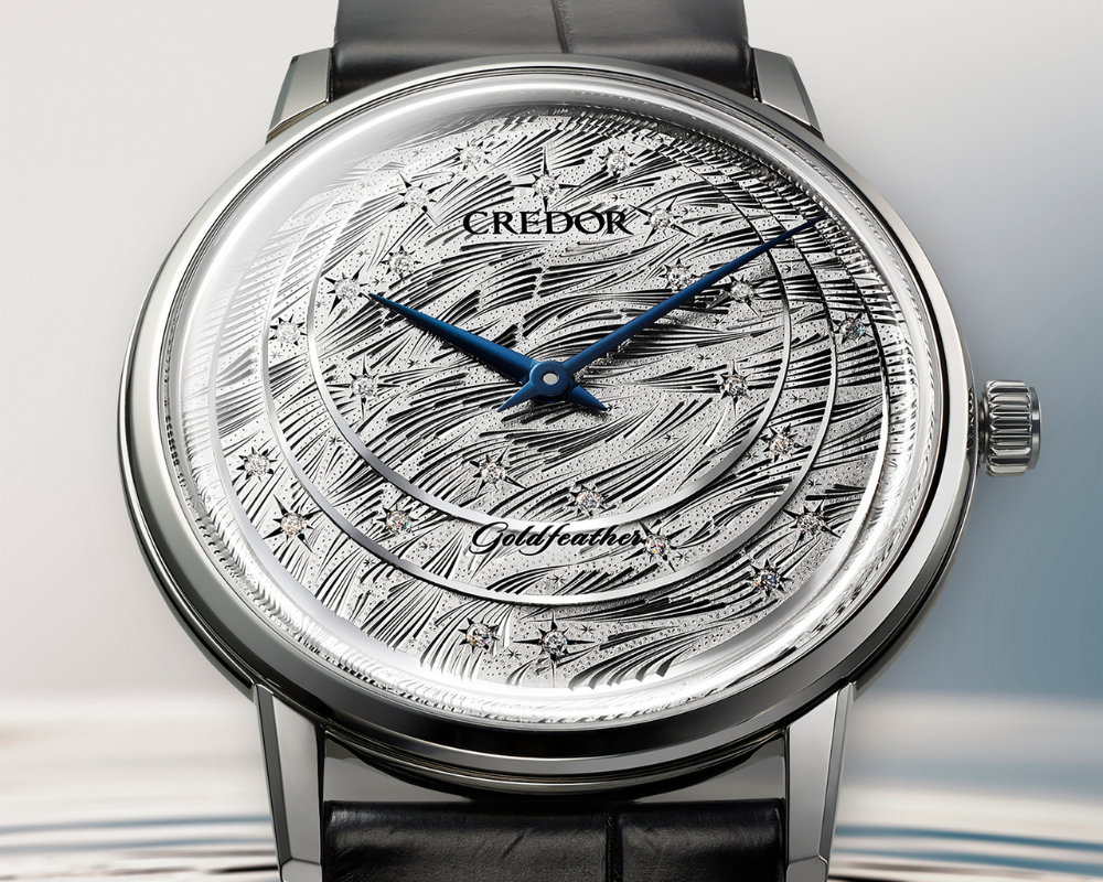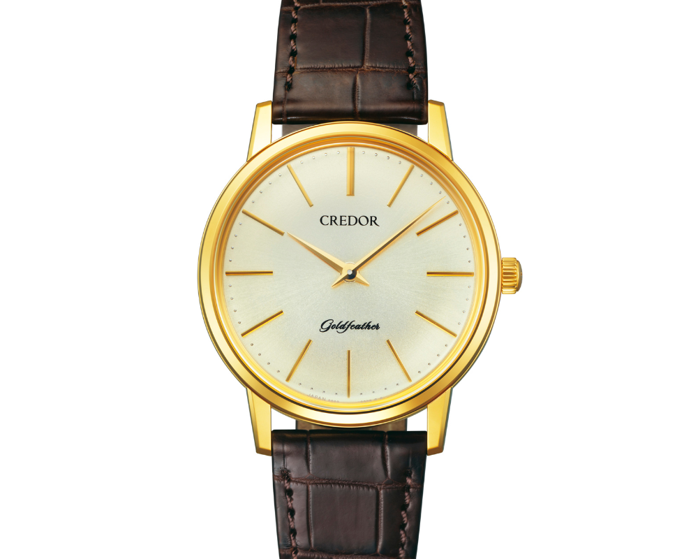 Reedição de um modelo lançado originalmente em 1960, o Credor Goldfeather foi relançado em 2023 como um relógio de vestir ultrafino que representa leveza e elegância. Seu mostrador champanhe com acabamento raiado irradia um brilho suave e sofisticado, contrastando com o aro e as asas polidas.