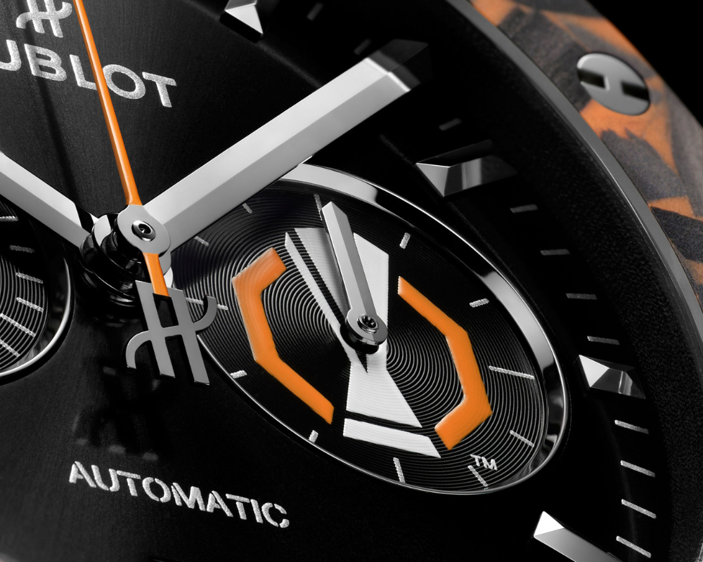 O relógio é equipado com o movimento cronógrafo automático HUB1153. Um detalhe especial aparece no mostrador: o logotipo da UEFA Europa League está presente às 3 horas, cercado por uma linha laranja. O fundo da caixa também exibe o troféu da competição, que ainda aparece em miniatura dentro do estojo do produto.