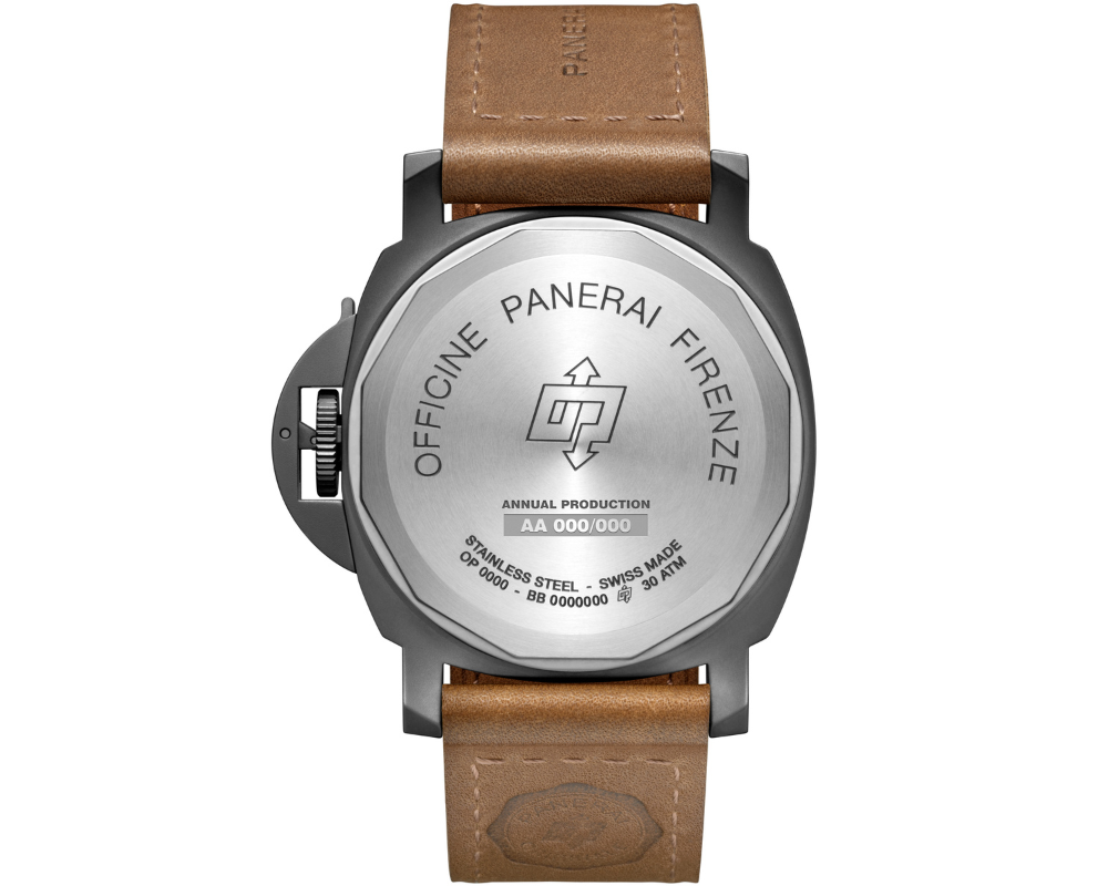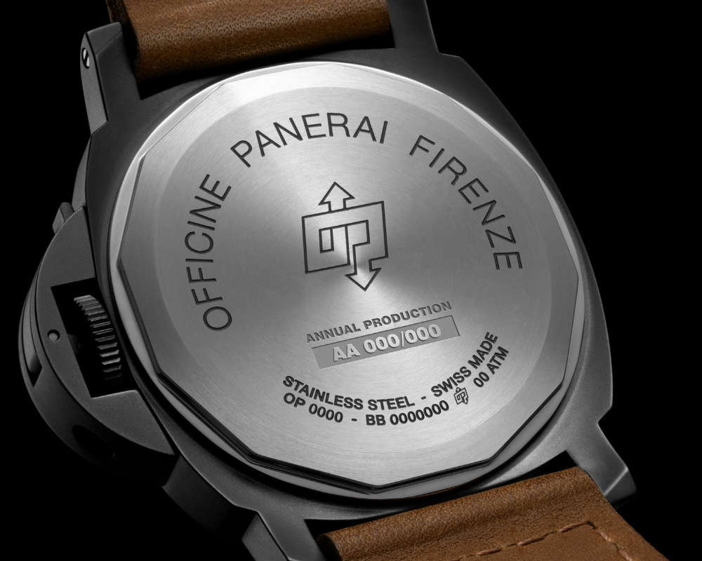No verso da caixa, fechado, aparece a gravação “Officine Panerai Firenze”. A pulseira de couro bovino em tom marrom dourado segue o design vintage da versão de 1993, com fivela em DLC preto e costura fiel ao modelo original. O kit inclui ainda uma pulseira adicional em borracha preta.