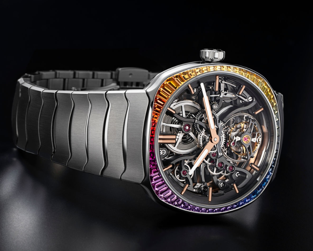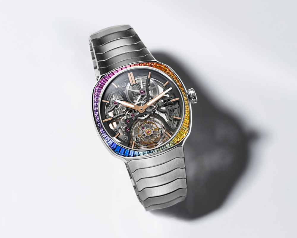 Combinação perfeita da arte do joalheiro e da excelência relojoeira, o Streamliner Tourbillon Skeleton Rainbow destila a essência do turbilhão e, simultaneamente, reforça a sua beleza. Este modelo, disponível em ouro rosa 5N ou aço, é decorado com sessenta safiras em talhe baguete em cores cintilantes. Selecionadas com o maior cuidado, cada pedra é única, tanto na forma como na cor. As pedras estão posicionadas num engaste invisível na carrure, numa dupla gradação perfeita: um gradiente de tons para reproduzir as cores do arco-íris e um gradiente de tamanhos para criar o formato “coussin” da caixa do Streamliner. As pedras preciosas iluminam este modelo inteiramente esqueletizado, jogando com o contraste entre o esplendor gracioso das safiras e a estética muito assertiva do mecanismo relojoeiro.