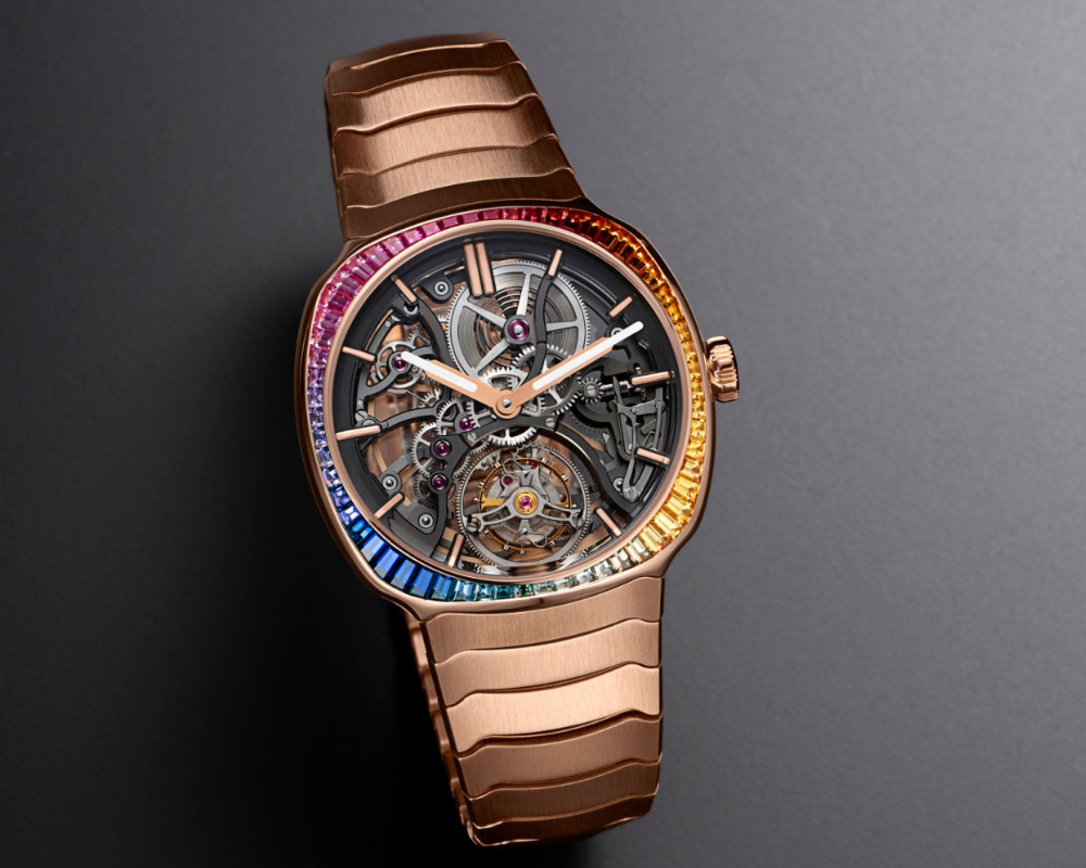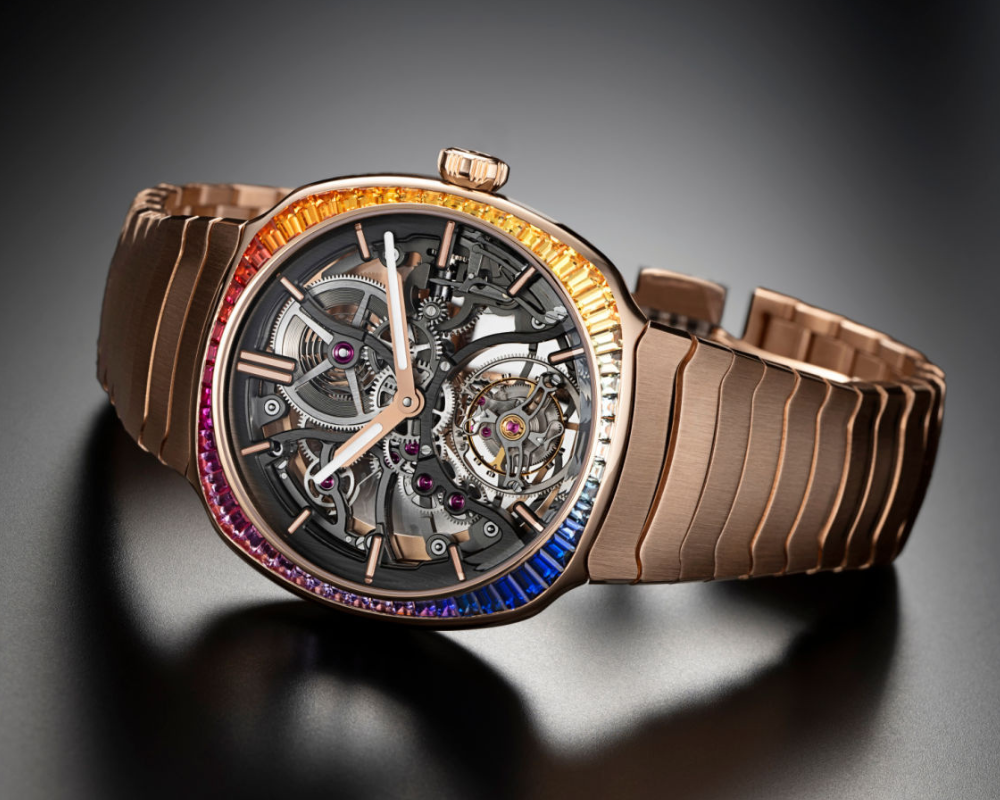 Referência 6814-0401, modelo em ouro rosa 5N, carrure cravejada com safiras coloridas em talhe baguete, mostrador esqueletizado, bracelete integrada em ouro rosa 5N