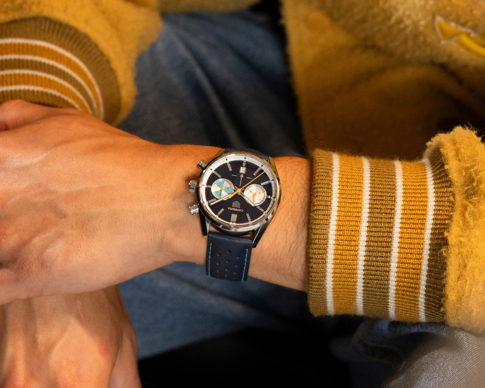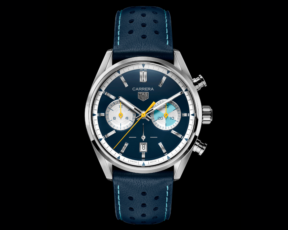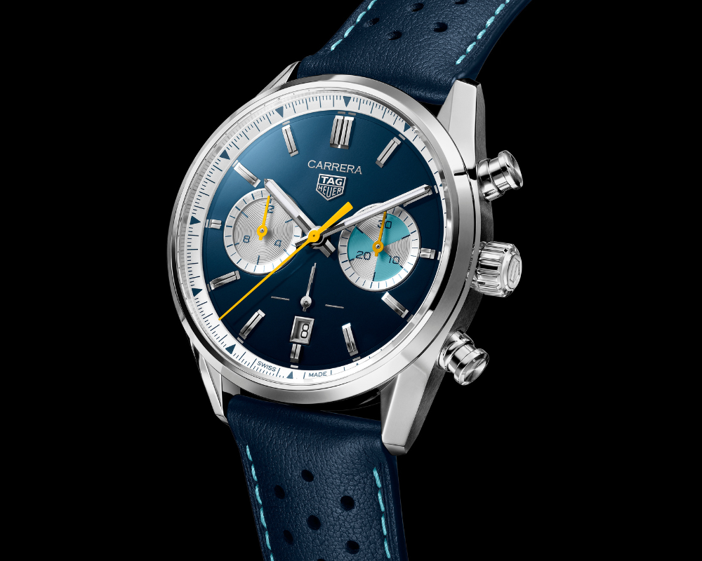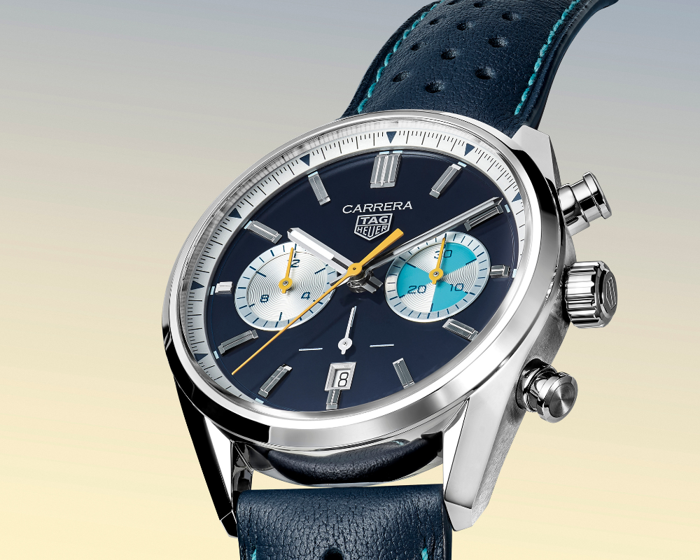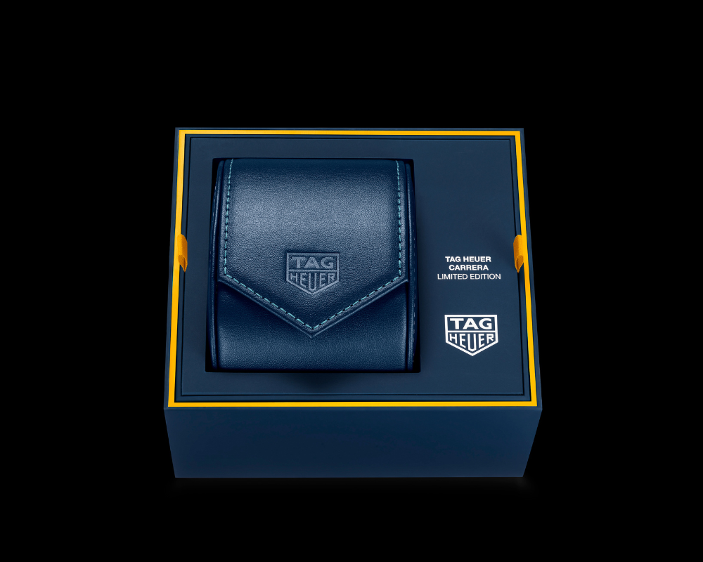 Com um mostrador azul marinho, detalhes em turquesa e toques vibrantes de amarelo, o relógio transmite uma energia dinâmica. Trata-se de uma interpretação moderna de um modelo Heuer dos anos 1950, fundindo com maestria elegância clássica e atitude contemporânea.