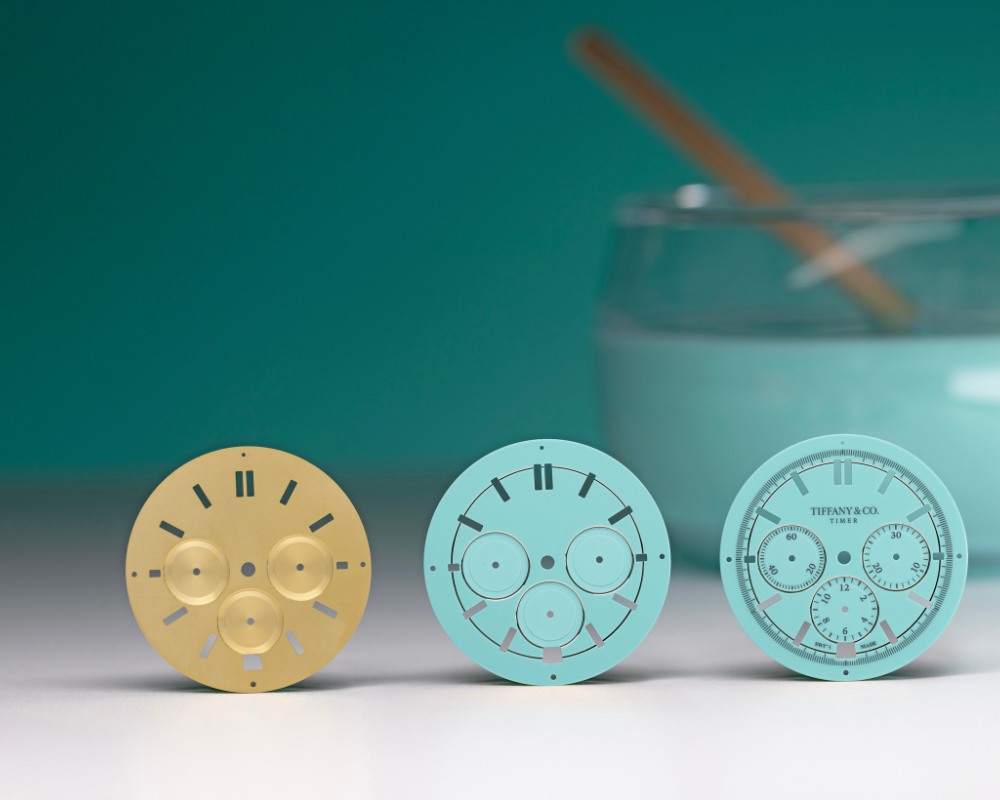 A fabricação do mostrador é uma verdadeira obra de arte. O processo envolve oito aplicações de verniz Azul Tiffany® e mais de 15 camadas de laca transparente, secagem rigorosa em estufa e acabamento com diamantes cravejados manualmente. Um trabalho artesanal que exige mais de 50 horas de dedicação e precisão absoluta.