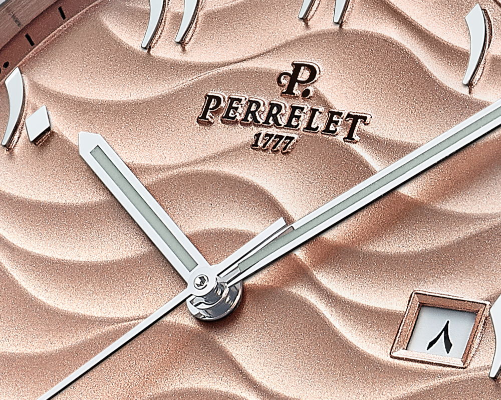 • Massa oscilante sólida com ranhuras verticais gravadas e logotipo Perrelet no centro