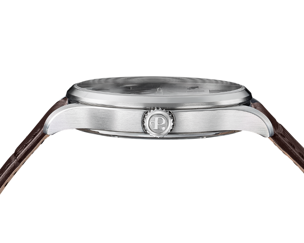 • Couro de bezerro marrom com motivo de jacaré, sistema de troca rápida e fivela personalizada com logotipo Perrelet